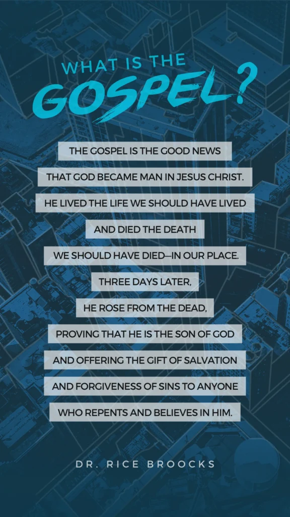 The Gospel is the good news that God became man in Jesus Christ. He lived the life we should have lived and died the death we should have died — in our place. Three days later, he rose from the dead, proving that he is the Son of God and offering the gift of salvation and forgiveness of sins to anyone who repents and believes in Him.